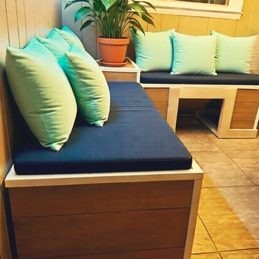 Solid wood, custom dimensions, with trim. Built to allow for a vent under the bench. Can be built to create storage inside with a lid.